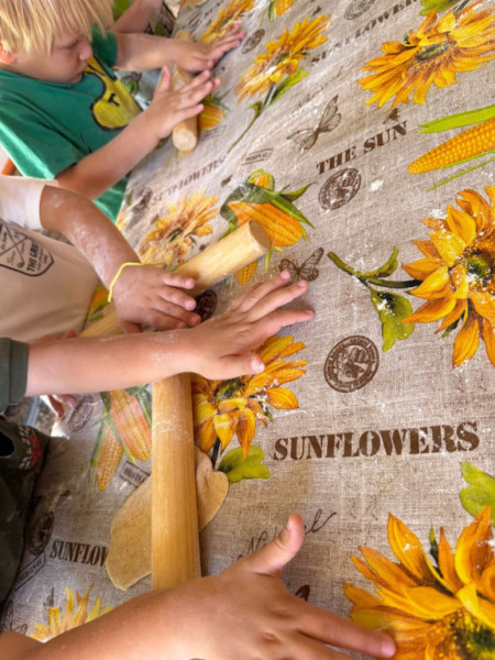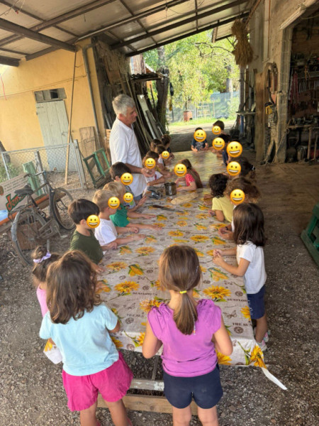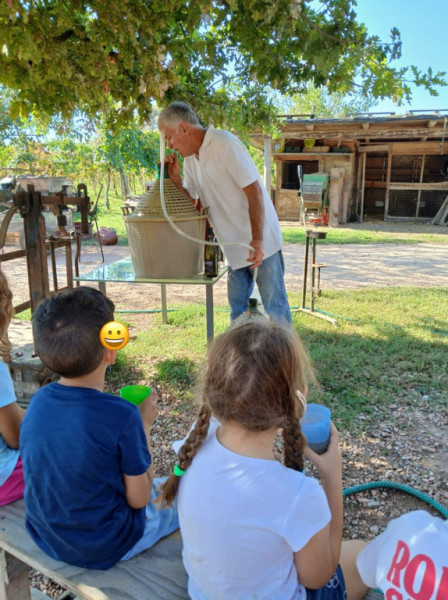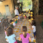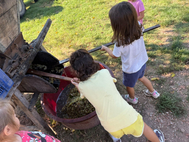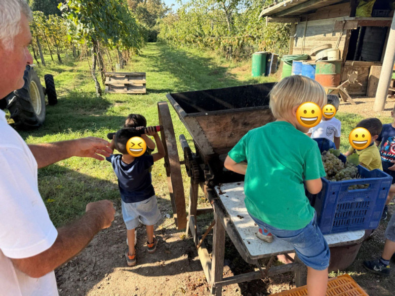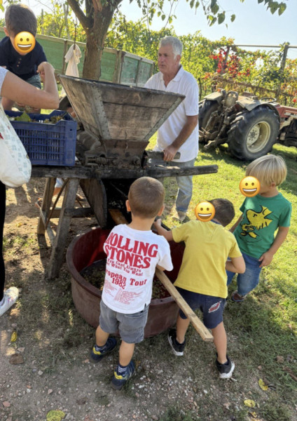 I bimbi di 5 anni della sezione Gialla si sono improvvisati " abili pigiatori di uva " .Tra risate e tanto impegno con i loro piedi hanno trasformato i grappoli in succo d uva .