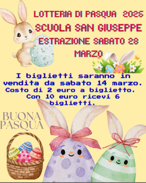 LOTTERIA di PasquaGrandi e golosi premi per tutti nella nostra lotteria di Pasqua.Biglietti in vendita da sabato 14 marzo.Estrazione sabato 28 marzo.1 biglietto €26 biglietti €10Volantino lotteria Pasqua 2026